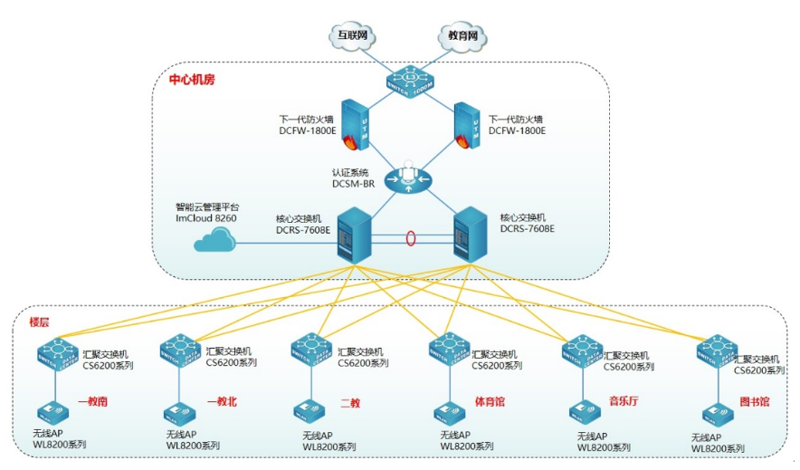 为方便用户对无线管理和维护,提升用户无线体验,使无线更智能化,此次采用evo视讯官网智能云管理平台ImCloud 8260实现无线统一的管理、维护、认证,并可实现对全网无线设备管理、实现易部署、易维护、易扩展的无线网络。evo视讯官网云管理ImCloud方案是网络服务的新模式,基于云端实现网络服务和管理,将复杂的网络管理简单化、智能化、可视化,提升用户网络体验。同时为了保证无线的安全,无线采用Portal准入认证,云管理ImCloud和evo视讯官网身份认证系统DCSM-BR实现联动,用户需要顺利获得账号和密码认证成功后才能接入无线网络,在保证无线连接的便捷性同时兼顾无线的安全性。